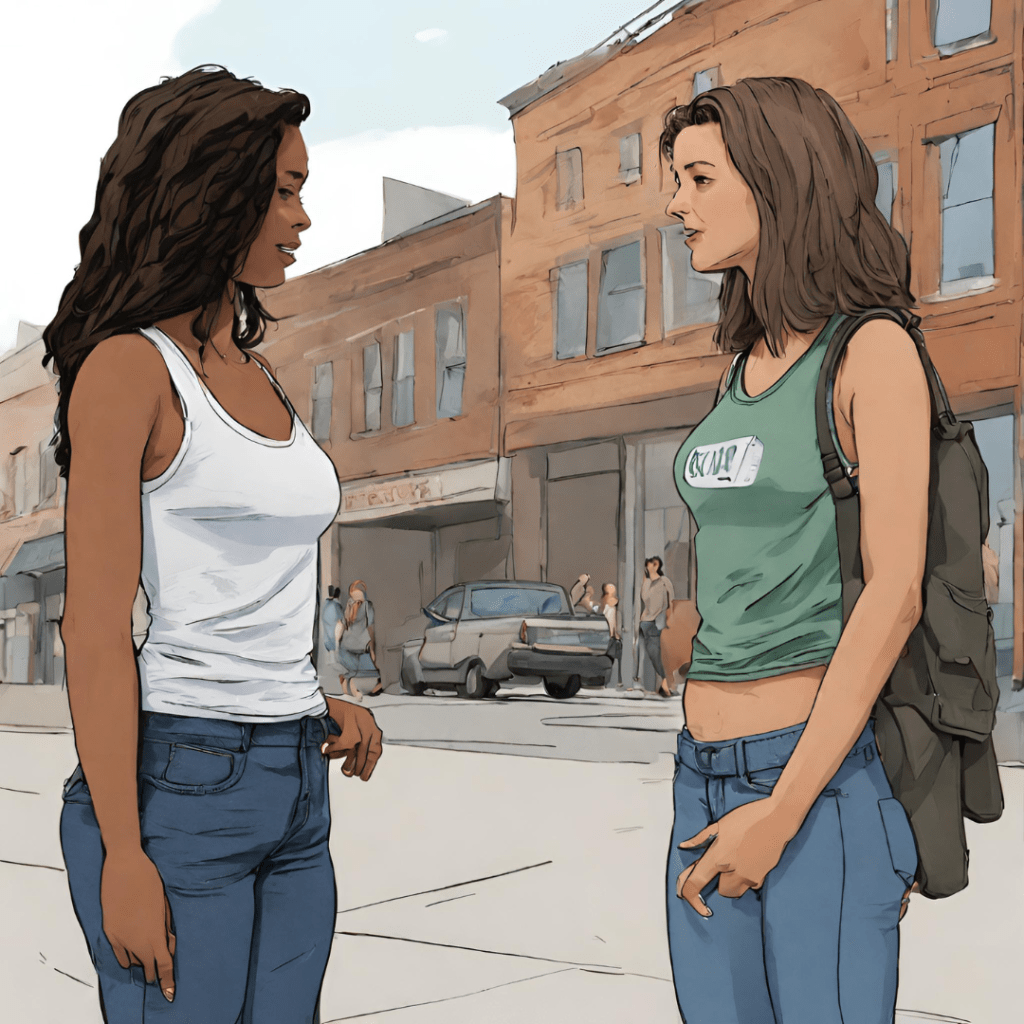 Reconheci minha colega Luísa, do ensino médio. Estranhei porque estava usando calça jeans, regata e o cabelo cortado acima dos ombros.